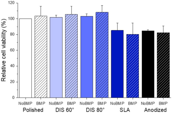 Figure 8 shows cell viability results after 3 days of cell culture of all studied surfaces measured by the metabolic activity of C2C12 cells. Percentages of cell viability were calculated using polished without BMP-2 as reference (100%), observing that all surfaces achieved cell viability percentages from 80 to 120%.