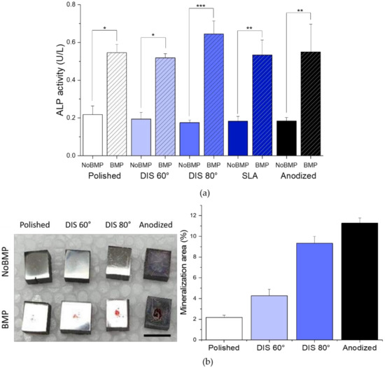 - Cell differentiation and mineralization, determined by ALP activity and calcium nodules formation, respectively, were enhanced in the presence of BMP-2 for all samples. In particular, we observed that this effect was more pronounced on DIS 80° and Anodized samples with BMP-2 (>2-fold increase in ALP activity compared to their counterparts without BMP-2 and >3.3-fold increase in cell mineralization compared to polished samples with BMP-2).
