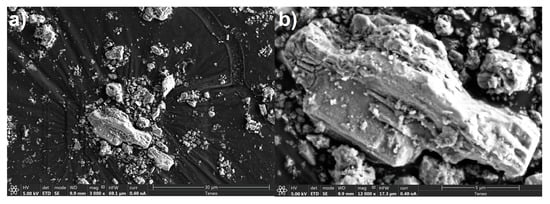 Images of ladle furnace slag with scanning electron microscope at different magnifications in the secondary option. (a) 3000×; (b) 12,000×.