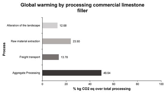The results of the environmental impact, due to global warming, of limestone filler show a higher percentage of CO2 emissions in the aggregate processing stage. This result is logical if we take into account the huge equipment required for the reduction of the particle size received from the quarry. Subsequently, and with lower emissions, there is the stage of mineral extraction. This stage produces significant emissions due to the use of explosives and the use of fossil fuel-powered machinery to load the extracted material. Finally, and with similar environmental effects, there are the stages of landscape alteration and transport of materials. Both stages produce important contamination, although they are necessary and inevitable for the processing of raw materials and the obtainment of limestone filler.