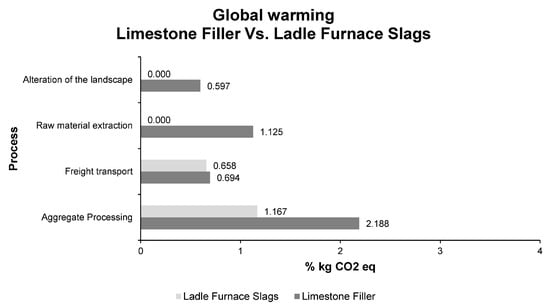 Figure 5 shows how the landscape alteration stage in the ladle furnace slag produces null emissions. This is due to the fact that the slag is an industrial by-product, so there is no need to alter the landscape, geology or hydrogeology. The same applies to the stage of extraction of materials. In this stage the limestone filler provides high emissions, while the ladle furnace slag has null emissions. As in the previous case, these null emissions are due to the fact that the ladle furnace slag is not required to be extracted, but is produced in the metallurgical industry. On the other hand, the transport stage develops similar CO2 emissions between the ladle furnace slag and the limestone filler. However, the emissions for the slags are slightly lower due to their smaller particle size and consequently a better use of the vehicle volume. Finally, in the processing stage, there is an important difference between the slag and the limestone filler. This is due to the fact that the limestone filler must be crushed with different equipment to reduce the particle size until a quality filler is obtained. On the other hand, the ladle furnace slag has a suitable particle size for its use, so it is simply necessary to sift it to remove particles larger than 2 mm. Therefore, the results for emissions in kilograms of CO2 equivalent for the impact of global warming show a clear environmental advantage of ladle furnace slag over commercial limestone filler, reflecting total process values of 1.82 and 4.60 respectively. In other words, there is a 60% reduction in emissions of kilograms of CO2 equivalent for the use of ladle furnace slag instead of a commercial limestone filler.