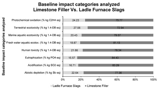 Consequently, once the slag has been physically and chemically characterized, an environmental assessment is made using the SimaPro software version 8.3.0.0 from PRé Consultants (Amersfoort, the Netherlands). To compare the results, the environmental cost of a commercial limestone filler was also evaluated. There are several reasons for selecting this commercial filler. On the one hand, it is the most common filler used in bituminous mixtures. On the other hand, it has similar physical characteristics to ladle furnace slags. And finally, even though the ladle furnace slag has cementitious properties comparable to cement, an environmental assessment of this material was ruled out, as it would reflect very negative results compared to the slag. This is due to the fact that the production of cement requires the use of high temperature processes. Therefore, the environmental benefits of slag compared to a limestone filler will be compared, even though slag has superior characteristics, as several investigations have shown.