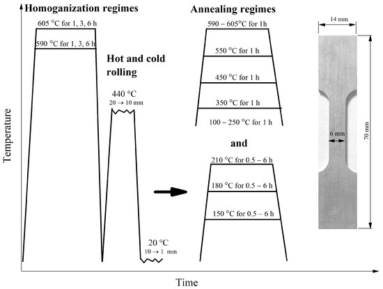 Scheme of the thermo-mechanical treatment of the alloys and tensile test sample.