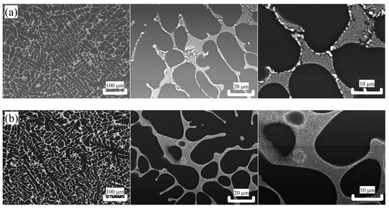 As cast microstructure of the Al-Cu-Yb (a) and Al-Cu-Gd (b) alloys at different magnification.