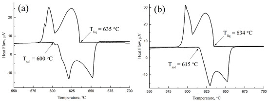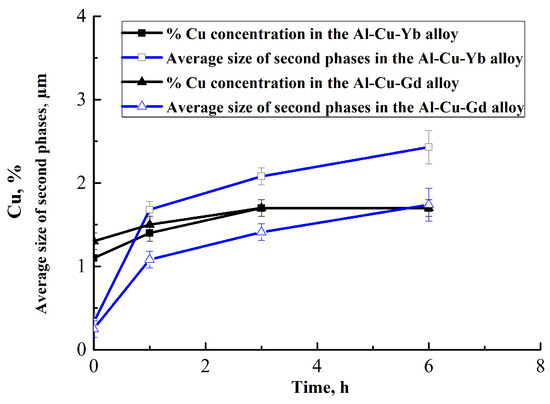 The DSC analysis showed that the liquidus and solidus temperatures for the Al–Cu–Yb alloy are 635 and 600 °C, respectively (Figure 4a), while for the Al–Cu–Gd alloy are 634 and 615 °C, respectively (Figure 4b). The solidus temperature was determined on the cooling curve (bottom curve) and the liquidus temperature on the heating curve (upper curve). The solidification range of the alloy is about 20–35 °C. The wide solidification range should provide a good castability. In accordance with the solidus temperatures of alloys, the temperature of 590 and 605 °C were selected as the homogenization temperature before quenching for Al-Cu-Yb and Al-Cu-Gd alloys, respectively. Figure 5 illustrates the SEM microstructures of the Al-Cu-Yb and Al-Cu-Gd alloys after homogenization at 590 and 605 °C for 1, 3 and 6 h with subsequent water quenching. It can be seen that during homogenization, there take place processes of fragmentation, spheroidization, and growth of the Al8Cu4Yb and Al8Cu4Gd eutectic phases. The size of Al8Cu4Yb and Al8Cu4Gd phases increased from 0.25–0.3 to 1.8–2.4 µm (measured by random secant method) after homogenization to 6 h. The copper concentration in the solid solution increases from 1.1–1.3 in the as-cast state to 1.7% (point SEM analyze) in both Al-Cu-Yb and Al-Cu-Gd alloys after 3 h of annealing and remains unchanged as the annealing time increases to 6 h. Figure 6 illustrates the changes of the intermetallic phase particle size and the concentration of the copper in the aluminum solid solution depends on the homogenization time.