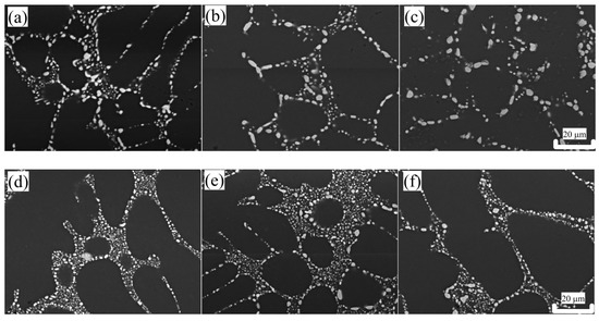 Microstructure evaluation of the Al-Cu-Yb (a–c) and Al-Cu-Gd (d–f) alloys after homogenization treatment for 1 h (a,d), 3 h (b,e) and 6 h (c,f).