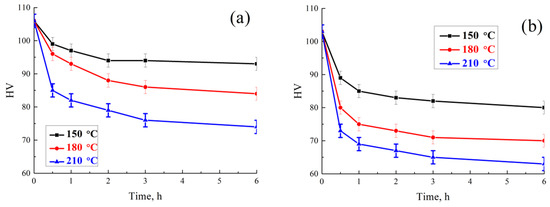 Figure 7 shows the hardness of the rolled alloys at different annealing temperatures 150, 180 and 210 °C for 0.5, 1, 2, 3 and 6 h (Figure 7a,b). The results showed that the hardness of Al-Cu-Yb and Al-Cu-Gd alloys decreased with increasing annealing temperature and time, this may be attributed to the decrease in dislocation density, and formation of subgrains. On the other hand, the hardness of the Al-Cu-Yb rolled alloy was higher than that of Al-Cu-Gd in the same case of annealing temperatures and time. This may be attributed to the presence of either the Al3Yb or (Al,Cu)17Yb2 phase, which increased the alloy’s mechanical properties.