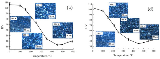 HV vs. time (a,b) and temperature (1 h) (c,d) dependencies of the rolled Al-Cu-Yb (a,c) and Al-Cu-Gd (b,d) alloys (inserts in c and d—grain structure after annealing at indicated temperature).