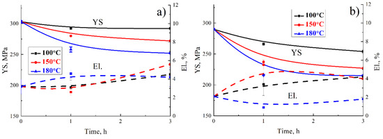 YS and El. dependencies vs. time after annealing at 100, 150 and 180 °C for the (a) Al-Cu-Yb and (b) Al-Cu-Gd alloys.