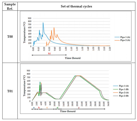 In this paper, different thermal cycles were applied to the various welded samples in order to evaluate their influence in the joint’s mechanical properties. These different thermal cycles can be observed in Figure 1 (the reference coding of these cycles is also displayed in this figure, being the same as the one presented in [27]). Table 5 provides information on the temperature that was used in the different thermal cycles. This information was obtained from two thermal couples that were placed in two opposite extremities of the pipe (placed in the interior of the Pipes 1 and 2, during the welding procedure). These positions are A (for the top part of the pipe) and B (for the bottom part). Next, the different cycles will be presented, mentioning the main reasons for their application in this study: