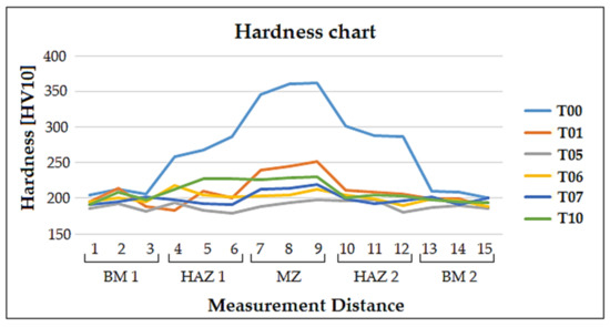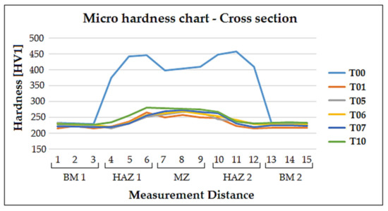 Hardness profile of the differently treated welded samples across all zones of the weld (BM 1, HAZ 1, MZ, HAZ 2 and BM 2 respectively).