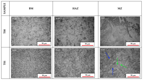 The various samples’ microstructures were analyzed using optical and electron microscopy. Assorted images of the different zones of the weld were taken with the most representative micrographs being presented in Figure 4. Studying the microstructure of these welds gives relevant information about the behavior of all the different weld zones.