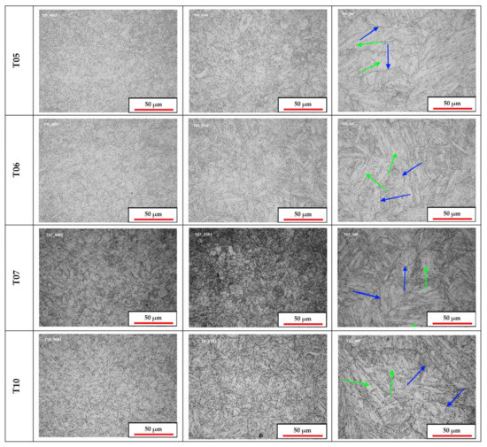 As seen in the previous article [27], the microstructures of all samples consisted of tempered martensite, conferring excellent joint properties, except for the untreated sample (T00). The sample that underwent the recommended treatment had a typical grain size in the HAZ of about 20–30 µm, with this grain being larger in the MZ, with a size of about 60–70 µm. Moreover, in this sample the grains were well defined with clear areas of tempered martensite. Regarding sample T05, the microstructure was well defined as well, registering a change in grain size from the HAZ (finer) to the MZ (coarser), similar to what was seen in the sample T01; there was also the clear presence of precipitates such as M23C6, which is related to good mechanical properties [13]. The microstructure of the sample T06 was very similar to the one observed in T05, however, in this case there were zones of undefined grain boundaries registered in the microstructure, especially in the MZ. For the sample T07, the microstructure was also like the last two samples. However, there were more areas of undefined grain boundaries present in the MZ when compared to the T05. Moreover, grain coarsening was registered in HAZ 2, which is undesirable for the usual application targeted by this material. As for the last sample of this batch, T10, the grain size was observed to be quite regular throughout both HAZ, however, in the MZ there registered grains that ertr too big or too small, resulting in an abnormal discrepancy in grain size. Furthermore, there were some zones of undefined grain boundaries in the MZ of this sample.