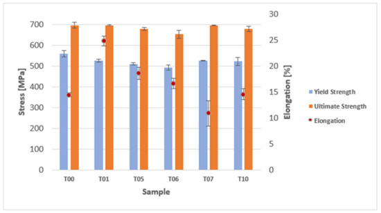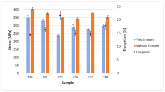 It can be observed that all the tested samples surpassed the minimum values, and they all ruptured by the base material after testing. The values of yield strength and ultimate tensile strength for the T00 sample were quite high, this was expected as this sample was not heat treated [22]. However, this sample exhibited very low values of elongation. The results of the tensile tests performed at room temperature can be observed in Figure 5, under the form of a bar graph.