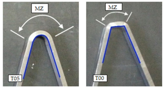 The bending tests followed the same procedure of the ones performed on the previous work [27]. After the bending tests, the samples were inspected and subjected to penetrant liquid tests to identify possible cracks. As seen in the previous work, the samples exhibited no cracks and, after bending, the new samples T05, T06, T07 and T10 described a perfect curvature, unlike the one described by the untreated sample (T00), in Figure 7 a comparison between the curvature of the treated sample, T05, and the untreated sample, T00, could be observed.