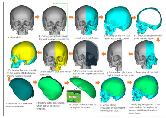 The mirroring operation is performed based on the healthy right side of skull region. For this purpose, the entire left affected region across the symmetric plane is removed as depicted in Figure 2g. Subsequently, the mirroring operation is implemented to imitate the right healthier side on the left side of the skull (Figure 2h,i). Then, the Boolean subtraction operation is performed on the mirror and tumor assumed model in order to get the implant template (Figure 2j,k). The outer region of the implant template is marked to get the implant outline pattern (Figure 2l). An offset thickness of 1mm is provided on the pattern to create the final implant design (Figure 2m). Finally, the implant design is evaluated through a virtual fitting on the polymer model (Figure 2n) and fixing plates are designed onto the outer ends of the implant to attain implant stability and implant–bone fixing (Figure 2o).