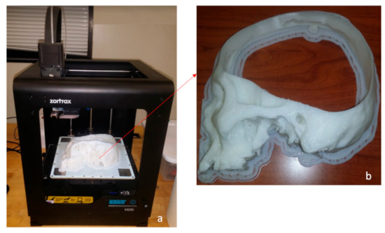 (a) Zortrax additive manufacturing (AM) machine with the fabricated (b) polymer skull.
