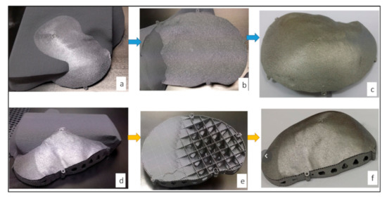 The EBM produced customized cranial implant without supports (a–c) and implant with support structures (d–f).