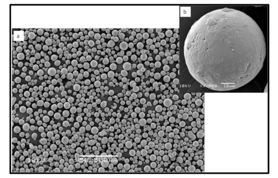 (a) SEM image of Ti-6Al-4V powder particles of different sizes and (b) an individual particle.