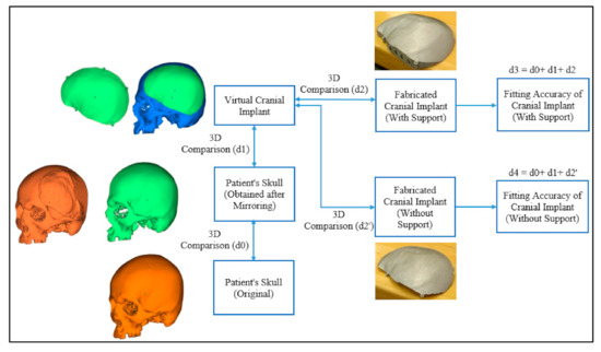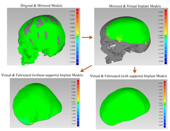 Figure 12 illustrates the procedure employed to compute the 3D deviation. In this analysis, the defect or tumor is purposely produced in the normal skull and then the healthier right half is replicated on the left faulty portion. The unreal defect is incorporated so that we have the patient’s real skull as a guide for comparison thereafter. In the case of the genuine defect, it is not feasible to get a patient’s scan (and hence the actual reference) when he/she was healthy. The mirrored model is therefore treated as the reference model in most instances [49]. The utilization of the mirrored model as a reference is not a very reliable approach as it does not incorporate the mirroring bias. In this work, the defect is therefore assumed in the healthier patient to accurately measure the possible error produced in the customized implants. First, the mirrored model is evaluated with the healthy skull of the patient and the overall variance (in the outer direction) is measured. This characterizes the error of mirroring. Next the mirrored model is assessed relative to the virtual cranial implant (because the mirrored model is used as a template to create the implant). This measures the design error of the virtual implant. Finally, the fabricated implants (with and without supports) are examined relative to virtual implants. This gives us the fabrication error. The overall difference in the produced implants can therefore be determined by summing up mirroring, design and manufacturing errors, as shown in Figure 12. In this analysis, d2 symbolizes the manufacturing error of the cranial implant with support, while d2′ denotes the fabrication error of the cranial implant without support. The d3 is the cumulative error (or the fitting accuracy) of the cranial implant with supports and the d4 implies the total error of the implant without supports.