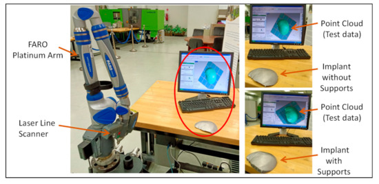 As shown in Figure 13, the outer surfaces of the fabricated implants are digitized using a laser line scanner mounted on the FARO platinum arm (FARO, Lake Mary, FL, USA). The FARO arm (with laser scanner) is preferred due to its availability, a reasonable precision of 20 μm and the ability to acquire a large number of points in short time.