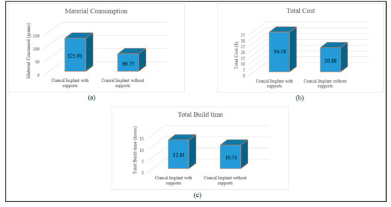 The cost and time analysis results are illustrated in Table 1 and Table 2 respectively. Figure 14a indicates, that the material consumption decreases significantly by 47% from 125.92 g to 66.75 g in the case of the implant without supports. Thus, the material consumed in the manufacture of cranial implants with supports is almost double that of the cranial implant without supports. The higher material consumption in turn raises the final cost of the cranial implant with support in comparison to the implant without supports. The cranial implant without supports costs roughly $21 in comparison to $34 for the implant with supports, thereby resulting in a 39% reduction in overall cost (Figure 14b).