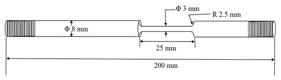 The test samples were machined from the round bars of AISI 316 stainless steel (SS) which are procured from George Archer metals, Australia. The chemical composition of SS is (wt%) is: C (0.027), Mn (1.800), Si (0.360), S (0.026), P (0.038), Cr (16.800), Ni (10.060), Cu (0.450), Mo (2.030), Co (0.190) and N (0.075). The tensile strength of the steel was 660 MPa. The uniaxial cylindrical tensile specimen had an outer diameter (OD) 8.0 ± 0.2 mm, with a gauge section of 3.0 ± 0.2 mm OD and 20.0 ± 0.2 mm length. Figure 1 presents a schematic diagram of the tensile specimens used in the present study. To determine the susceptibility to stress corrosion cracking in the simulated solutions of seawater, normal concrete, and seawater sea sand normal concrete, the slow strain rate testing (SSRT) was employed. To achieve different constant crosshead speeds (i.e., different strain rates), the SSRT rig is equipped with a controlled variable speed motor. The speed can be varied from 10% to 100% of the full motor speed that corresponds to various strain rates in the range of 10−7 s−1. SSRT rigs were constructed locally at Monash University, and the variable speed motors for these rigs were procured from Baldor Electric company (Fort Smith, AR, USA).