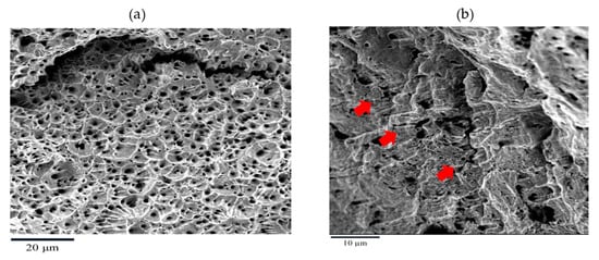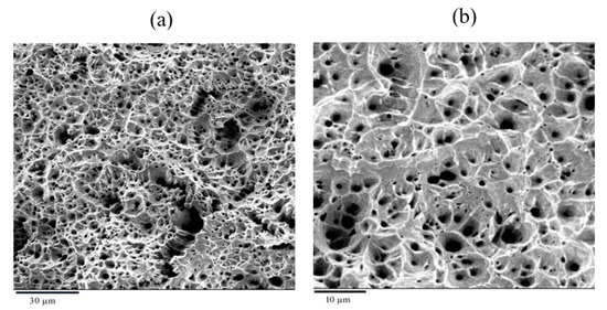 Again, SEM fractography was carried out to ascertain whether SCC contributed to the fracture of specimens in NC and SWSSNC at 60 °C. Representative fractographic features (Figure 5) suggest only ductile dimples over the fracture surface, confirming absence of SCC in SWSSNC and NC at 60 °C.