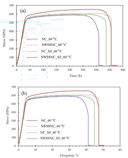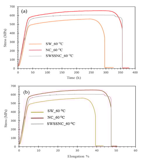 (a) Stress vs. time, and (b) stress vs. elongation plots of AISI 316 stainless steel alloy at strain rate of 3.7 × 10−7 s−1 in the simulated solutions of SW, NC and SWSSNC at 60 °C.