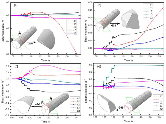 - The evolution of each slip system was determined by the initial grain orientations and grain locations. The grains at the end of the workpiece require less resistance due to coordinated deformation among the grains. The grain orientation after deformation appears near to the initial orientation.