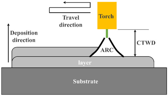 The 3D printing process refers to additive manufacturing (AM), in which 3D objects are manufactured by depositing materials based on 3D computer-aided design (CAD) information [10,11]. The first-generation 3D printing equipment is a commercial 3D system rapid prototyping machine, it is developed in the late 80 s, and various 3D printing machines such as powder bed fusion (PBF) processes and binder jetting (BJ) method have been developed since the 90 s [12]. One of the AM processes, direct energy deposition (DED) is deposited by melting a powder or solid filler metal using a heat source such as an electron beam, arc, or plasma [13]. Recently, CO2 lasers, Nd:YAG lasers, Yb-fiber lasers, and excimer lasers are extensively used as 3D printing sources due to which bring great benefits, such as energy-saving, less material consumption, and efficient production [14,15]. Wire-arc additive manufacturing (WAAM) is one of DED process that uses the conventional gas metal arc welding (GMAW) process as a heat source to deposit solid metal filler wires [16].