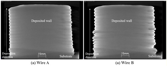 Figure 4 shows a 100 mm long and 100 mm high wall deposited with various types of filler metal. Since the molten metal is solidified during the deposition process, strong dendrites are formed around small nuclei, causing metal anisotropy, which is determined by the deposition direction [27,28]. Wei [29] reported that in the deposition process using arc welding, the dendrites were determined by the deposition direction, and the bead shape and the surface condition of the beads were similar after deposition. The deposited walls were made uniformly, but there were lateral collapses at the start and endpoints of some layers of both walls. Typically, this is due to excessive heat sinks, heat input, cooling rates, or molten metal in the weld pool [30,31]. It can also be caused by errors such as mis teaching, manual teaching, and arc end delay time. The reason why the bead collapsed at the start and endpoints in this study is due to the lack of consistency of the welding start position by manual welding. However, from the perspective of the WAAM process, the collapsed bead is cut by processing to make the final product, so it is not important in terms of product precision. In general, evaporated wall parts have defects such as internal voids due to rapid solidification and shrinkage, which should be noted because mechanical properties such as tensile strength, fatigue performance and impact resistance are affected [32].