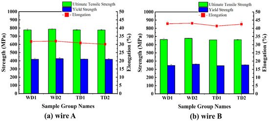The visual inspections and X-ray results confirmed that the dimensions of the deposited walls were similar for both types of filler metal wire. To compare the mechanical properties of the deposited walls according to filler metal type, a tensile test was conducted. Figure 6 shows the strength testing results. Because the deposited NAB material is anisotropic, the strength test of the deposited NAB materials was performed in two directions and two angles on each of the two filler metals. These two directions are divided into type WD and type TD, samples from both wire types had better mechanical properties than the initial cast material (590 MPa). No direction-dependent effects were observed. However, the strength and elongation differed depending on filler metal type. For the deposited NAB components using wire A, the average tensile strength was 777.6 MPa ± 12.5 MPa, the average yield strength was 418.9 MPa ± 10.6 MPa, and the average elongation was 30%, regardless of the direction and angle.