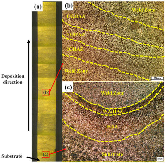 Microstructures were analyzed to determine reasons for changes in mechanical properties such as strength and elongation. Figure 7 is a macro photo of a cross-section showing a high-density NAB alloy wall deposited with wire A. Figure 7a shows an overall image of the deposited wall. I confirmed that it was formed quite evenly. Figure 7b shows a representative microstructure of the deposited area. The deposited walls are organized in the following order: weld zone (WZ)—CGHAZ (coarse heat affected zone)—FGHAZ (fine heat affected zone)—ICHAZ (inter critical heat affected zone) formed by reheating—weld zone. Mainly widmanstätten α and very fine martensite (dark areas) were observed.