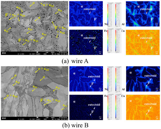 Figure 8 shows the microstructure and EPMA results for the deposited walls made with wire A. A mixture of tangled fine α platelets and dense lamellar eutectoid α + κIII structure with β′ phases was observed in Figure 8a. The lamellar eutectoid α + κIII structure formed with serrated boundaries near α platelets. Additionally, the β′ phases were found at the grain boundaries of α phases, consistent with the EPMA results. Furthermore, a larger amount of κIV precipitates were observed than in wire B. These structural features would have resulted in a fine α grain size and increment of strength [35]. Additionally, a larger amount of κII precipitates were observed than in wire B, which could reduce the ductility of the product. The increase in tensile and yield strength in the product made with Wire A can be attributed to the finer and more homogeneous solidification structure (grain boundary strengthening) and the presence of numerous fine κIV precipitates. These microstructural features can be attributed to the large amount of alloying elements in wire A; it had a greater chance of forming β phases, which transformed into β′ + κ precipitates during the subsequent cooling, rather than dissolving into α phase. The lamellar eutectoid intermetallic κ phase formed as penetrations into α platelets.