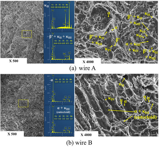 The fracture surface of the transverse tensile test is shown in Figure 9. In both cases, it was observed that brittle fracture and micro void adhesion were mixed with elongation of 20% or more in both the fractured surface. The deposited walls mainly contain widmanstätten α. The fracture surface exhibits the lath structure, and it was observed that the fracture propagates preferentially along the lath boundary. The fine dimples on the fracture surface match the microstructure. In the case of the sedimentary wall made of wire A (Figure 9a), a complex structure dominated by α and β′phases with randomly scattered κ precipitates was observed, as can be seen from the microstructure analysis results. An intricately tangled fracture surface is shown in the enlarged image. A fracture face of the deposited wall made with wire B (Figure 9b) has a comparatively simple α and α + κIII eutectoid structure with κII and κIV, consistent with the microstructural analysis results. The fracture surfaces were found to function as an intergranular fracture mode of the dominant structures. We observed the grain boundaries of α and the location of the κ precipitates initially existed. The results indicate that the different filler metal types are associated with microstructural differences, such as the size of α phase and the fraction of the β′and κ precipitates, which appear to affect the fracture surface.