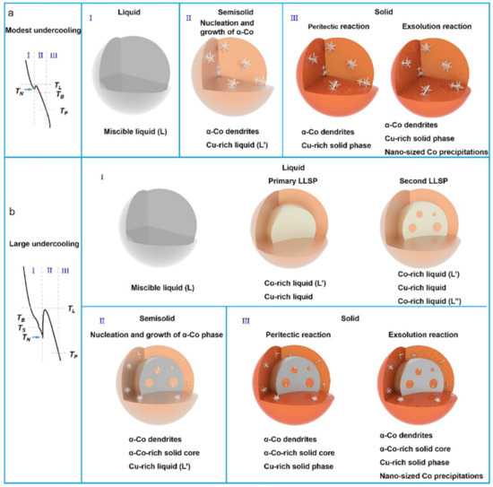 - Wei, C.; Wang, J.; He, Y.; Yan, Y.; Gao, J.; Li, J.; Beaugnon, E. Liquid-liquid phase separation in immiscible Cu-Co alloy. Mater. Lett. 2020, 268, 127585. [Google Scholar] [CrossRef]