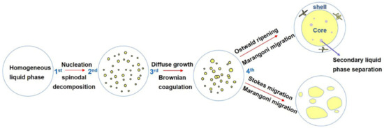- Shi, R.P.; Wang, C.P.; Wheeler, D.; Liu, X.J.; Wang, Y. Formation mechanisms of self-organized core/shell and core/shell/corona microstructures in liquid droplets of immiscible alloys. Acta Mater. 2013, 61, 1229–1243. [Google Scholar] [CrossRef]