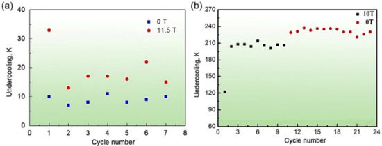 - Wang, J.; He, Y.; Li, J.; Li, C.; Kou, H.; Zhang, P.; Beaugnon, E. Nucleation of supercooled Co melts under a high magnetic field. Mater. Chem. Phys. 2019, 225, 133–136. [Google Scholar] [CrossRef]