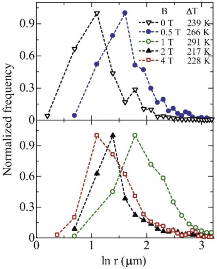 - Zhang, Y.; Gao, J.; Yasuda, H.; Kolbe, M.; Wilde, G. Particle size distribution and composition in phase-separated Cu75Co25 alloys under various magnetic fields. Scr. Mater. 2014, 82, 5–8. [Google Scholar] [CrossRef]