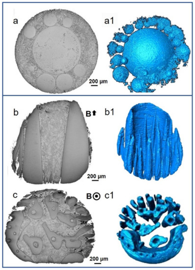 - Wang, J.; Zhong, Y.; Fautrelle, Y.; Zheng, T.; Li, F.; Ren, Z.; Debray, F. Influence of the static high magnetic field on the liquid-liquid phase separation during solidifying the hyper-monotectic alloys. Appl. Phys. A 2013, 112, 1027–1031. [Google Scholar] [CrossRef]