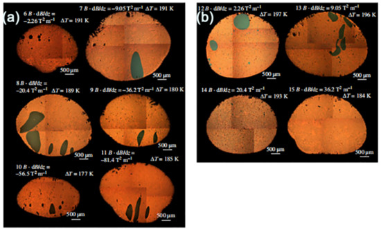 - Sun, Z.; Guo, X.; Guo, M.; Vleugels, J.; der Biest, O.V.; Blanpain, B. Alignment of weakly magnetic metals during solidification in a strong magnetic field. J. Alloy. Compd. 2013, 551, 568–577. [Google Scholar] [CrossRef]
