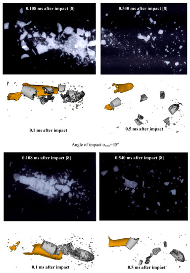 - Fras, T.; Murzyn, A.; Pawlowski, P. Defeat Mechanisms Provided by Slotted Add-on Bainitic Plates against Small-calibre 7.62 mm × 51 AP Projectiles. Int. J. Impact Eng. 2017, 103, 241–253. [Google Scholar] [CrossRef]