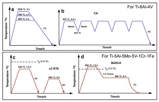Schematic of post-heat treatment: (a) solution treatment followed by furnace cooling (FC) for Ti64, (b) cyclic annealing (CA) for Ti64 [25], (c) solution treatment in the α+β phase field followed by aging (αβ-STA) for Ti55531 and (d) beta annealing followed by slow cooling and aging (BASCA) for Ti55511.