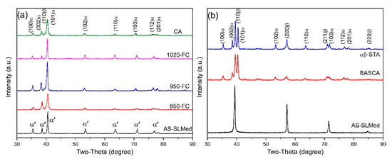 The X-ray diffraction (XRD) spectra of as-fabricated and post-heat treatment samples of (a) Ti64 and (b) Ti55511.