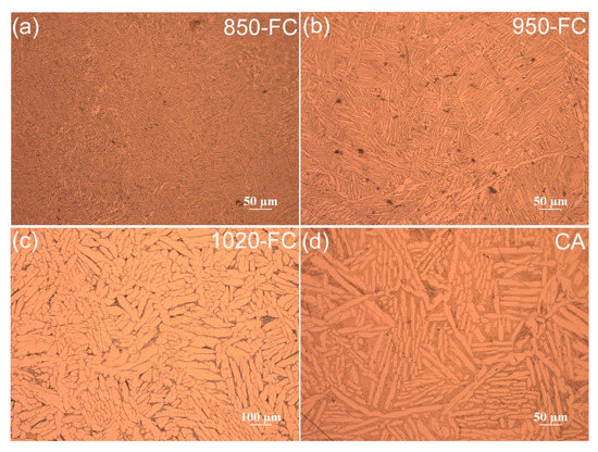 OM images showing the α+β structure of Ti64: (a) 850-FC, (b) 950-FC, (c) 1020-FC and (d) CA samples.