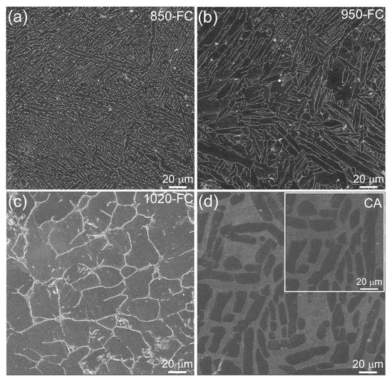 SEM images showing the heat-treated Ti64 specimens for: (a) 850-FC, (b) 950-FC, (c) 1020-FC and (d) CA samples.