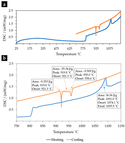 Thermal analysis was carried out using a differential scanning calorimeter (DSC-TGA Netzsch STA 449 F3 Jupiter, Selb, Germany). The samples were heated and cooled at a rate of 10 °C/min to determine the melting temperature and the phase transformation temperatures of the NiSi3B2 alloy.