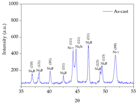 Table 2 shows the results of the semi-quantitative analysis of the alloy by SEM-EDS. Due to the difficulty in analyzing the boron amount because of its small atomic weight, the results of the semi-quantitative analysis of nickel borides are not present in Table 2. However, combining the EDS analysis with the XRD pattern depicted in Figure 3, Z3 likely corresponds to nickel boride (Ni3B) and Z1 corresponds to nickel-austenite (Ni-γ) that takes chromium, carbon, iron, and silicon into solid-solution in a content of about 4 wt.%. Considering the limitation of analyzing the individual phases present within the eutectic constituent, Z2 yields the average composition of the eutectic constituent (Ni-γ-Ni3Si) containing a higher content of silicon (approximately 9 wt.%.).