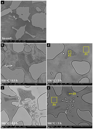 The solution heat treatment time and temperature determine the level of homogenization of the microstructure. Figure 4 shows the microstructural changes that occurred at 930 °C and 980 °C for 0.5 and 3 h. The increase in the holding time leads to the dissolution of the eutectic constituent (Ni-γ-Ni3Si), and it seems that the kinetics of the dissolution is faster at 980 °C. The holding time of 3 h is sufficient to promote the dissolution of the eutectic constituent (Z2) and to obtain a microstructure almost composed of nickel-austenite (Z1) and nickel borides (Z3), as seen in Figure 4e. Important also is the high content of nickel borides present after heat treatments: 42 ± 3% after 3 h at 930 °C and 980 °C. These results are similar to that of the as-cast sample (42 ± 2%), indicating that the solution heat treatments did not promote the dissolution of the nickel borides for the temperatures tested.